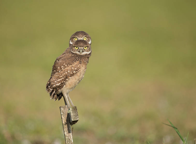 很满意自己捕猎成果的穴居猫头鹰。在田野上,摄影师一下子抓住了坐在一起的猫头鹰(佛罗里达)