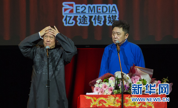 10月9日,悉尼,郭德纲(左)和于谦(右)在说相声。新华网发(朱宏业摄)