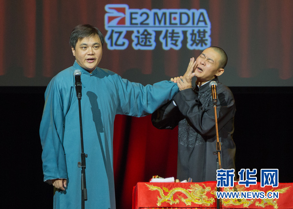 高峰(左)和栾云平(右)在说相声。新华网发(朱宏业摄)