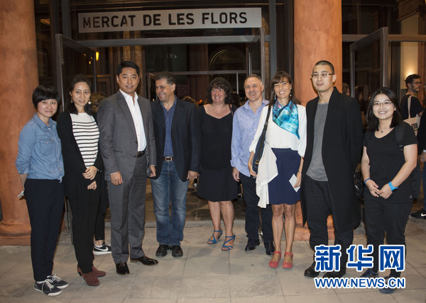 7日,中国驻巴塞罗那总领事汤恒(左三)与巴塞罗那孔子学院和亚洲之家负责人、以及“陶身体剧场”负责人等在演出的剧场外合影。新华网发(贺耀龙摄)