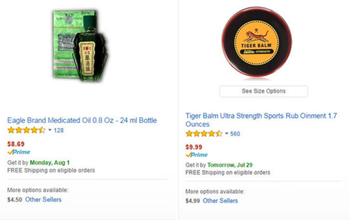 美国某购物网站销售的中国风油精和清凉油,销量和评价都不错,价格约为8-10美元。