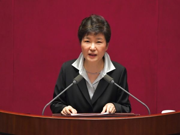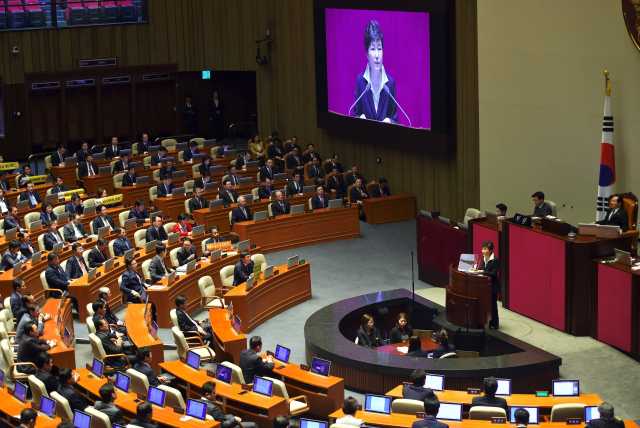 10月24日,韩国总统朴槿惠在国会发表讲话。(新华/法新)