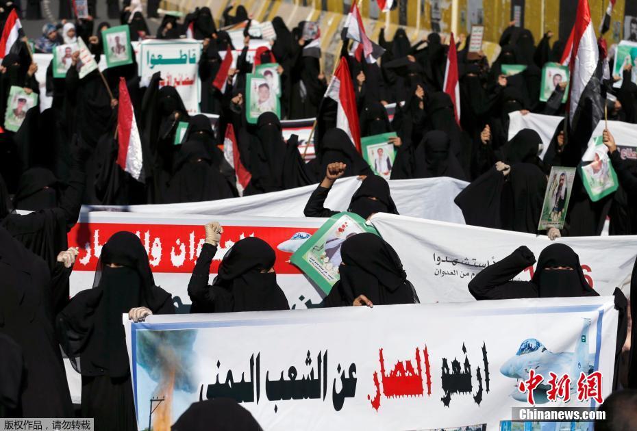 也门妇女着黑袍上街游行 抗议沙特联军空袭(组图)