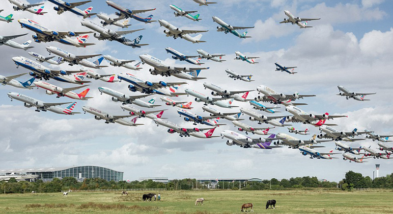 近日,英国政府批准伦敦希思罗机场扩建计划,决定修建第三条飞机跑道。与此同时,美国摄影师麦克 凯利(Mike Kelley)发布Airportraits系列摄影作品,展示希思罗机场百架飞机“同时起飞”和“同时返航”的壮景,令人十分震惊。
