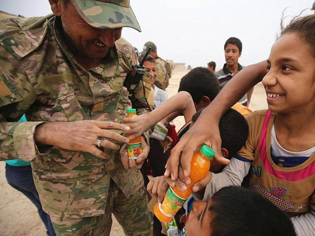 10月28日,伊拉克军队攻占摩苏尔以南乌姆迈赫希尔村,一名士兵向当地儿童分发着饮料。(新华/法新)