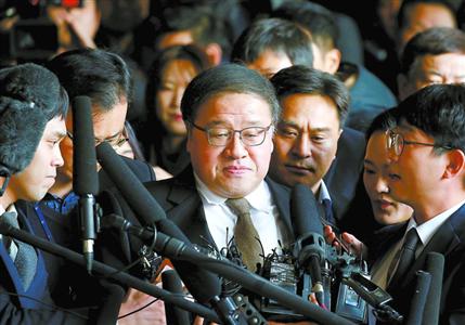 11月2日,韩国青瓦台总统府前政策调整首席秘书安钟范(中)被媒体包围。新华社/路透