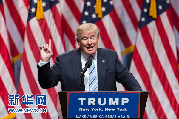 2016年美国总统选举11月8日举行。截至当地时间9日凌晨的初步统计结果显示,共和党总统候选人唐纳德·特朗普击败民主党总统候选人希拉里·克林顿,当选新一届美国总统。这是2016年7月16日唐纳德·特朗普在美国纽约的竞选活动上讲话的资料照片。 新华社记者李木子摄