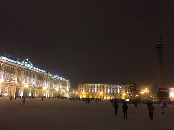 几名中国游客在雪中游览圣彼得堡东宫广场。(中国日报网 王召坤 摄)