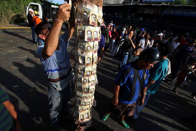 在委内瑞拉塔奇拉州的圣克里斯托瓦尔,人们将退出流通的100玻利瓦尔纸币贴在柱子上,抗议国内现金供应严重不足。(图片来源:新华社)