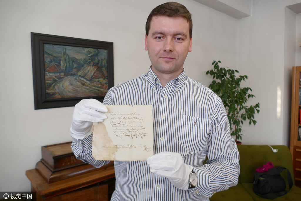 当地时间2017年1月11日,斯洛伐克特伦辛,世界最古老emoji微笑表情被发现,律师Jan Ladislaides在查1635年的档案时发现,距今有382年。图片来源:视觉中国