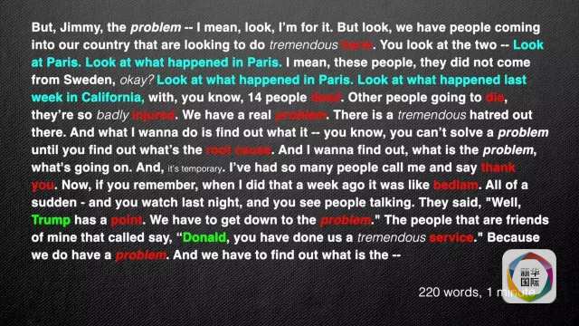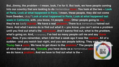1、刻意重复:如果我们把负面词汇标记出来,会发现特朗普先生很喜欢在句尾强调这些简单易懂的词,并在语气上加强;