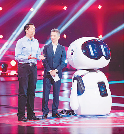 2017年1月6日,百度智能机器人“小度”和“小度之父”吴恩达(左一)亮相江苏卫视《最强大脑》。人民视觉