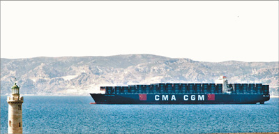停泊在马赛港的法国达飞海运集团的货轮上印着中国国旗,象征法中友好。