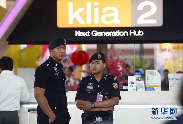 2月15日,在马来西亚吉隆坡国际机场,警察在航站楼内执勤。新华社/美联