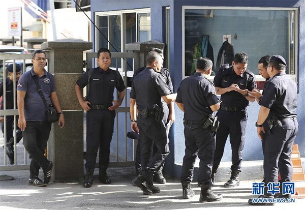 2月16日,在马来西亚吉隆坡,警察在一家医院的法医部外执勤。新华社/美联