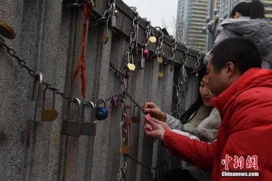 资料图:2月14日,情人节,重庆南滨路同心廊吸引众多情侣前往挂同心锁。周毅 摄