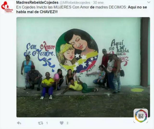 委内瑞拉妇女组织在街头合影,身后的涂鸦中包含“这里不说查韦斯的坏话”字样。