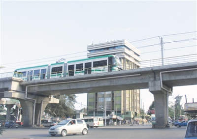 在埃塞俄比亚首都亚的斯亚贝巴,城市轻轨列车时尚而快捷,穿梭在高楼大厦之间。亚的斯亚贝巴城市轻轨是撒哈拉以南非洲地区第一条全电动轻轨,全长34公里,分为东西线、南北线两条线路,每天运行16小时,极大地缓解了当地的交通压力。该项目由中国中铁承建,深圳地铁集团提供运营管理服务,完全采用中国铁路技术标准,于2015年5月正式通车。