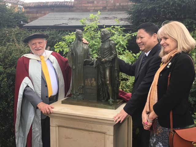 莎士比亚和汤显祖合体塑像在莎翁故居揭幕