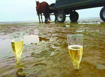 不到一个小时,每个人的网兜里都已经收获数十只生蚝,马车主人于是招呼大家到马车旁,打开一瓶香槟,来一顿“蚝酒野餐”。