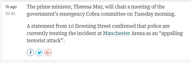 英国首相特雷莎·梅称:我们正全力确定这起被警方视为“骇人听闻的恐怖袭击”的全部细节。大曼切斯特市市长称这是“恐怖之夜”。