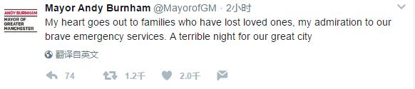 大曼彻斯特市市长在其官方推特上发表声明称:“我的心和失去至亲的家庭在一起,向我们勇敢的应急部门致敬。这是曼彻斯特的恐怖之夜。”