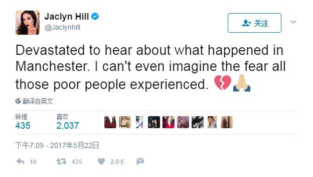 网友Jaclyn Hill表示:“听到曼彻斯特发生的事时我悲痛欲绝。我没有办法想象这些可怜的人所经历的恐惧。”