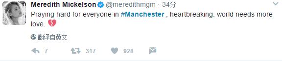 网友Meredith Mickelson表示:“为所有在曼彻斯特的人祈祷,心碎。世界需要更多的爱。”