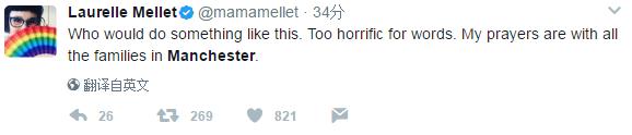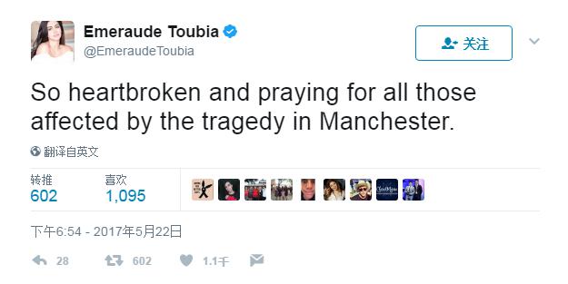 网友Emeraude Toubia表示:“心碎,为所有被曼彻斯特这场悲剧波及的人们祈祷。”