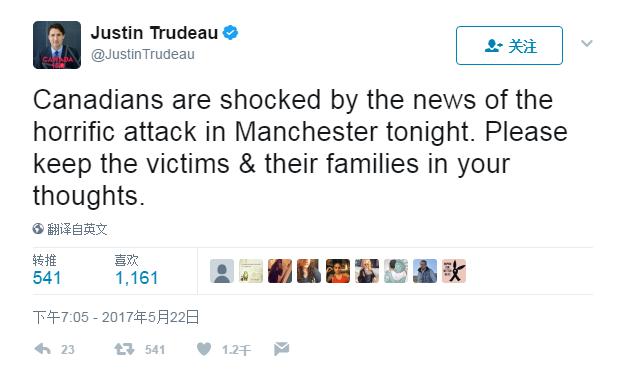 加拿大总理特鲁多22日在其推特上表示:“加拿大人民为今晚发生在曼彻斯特的袭击感到震惊。请把受害者和他们的家庭放在心上。”