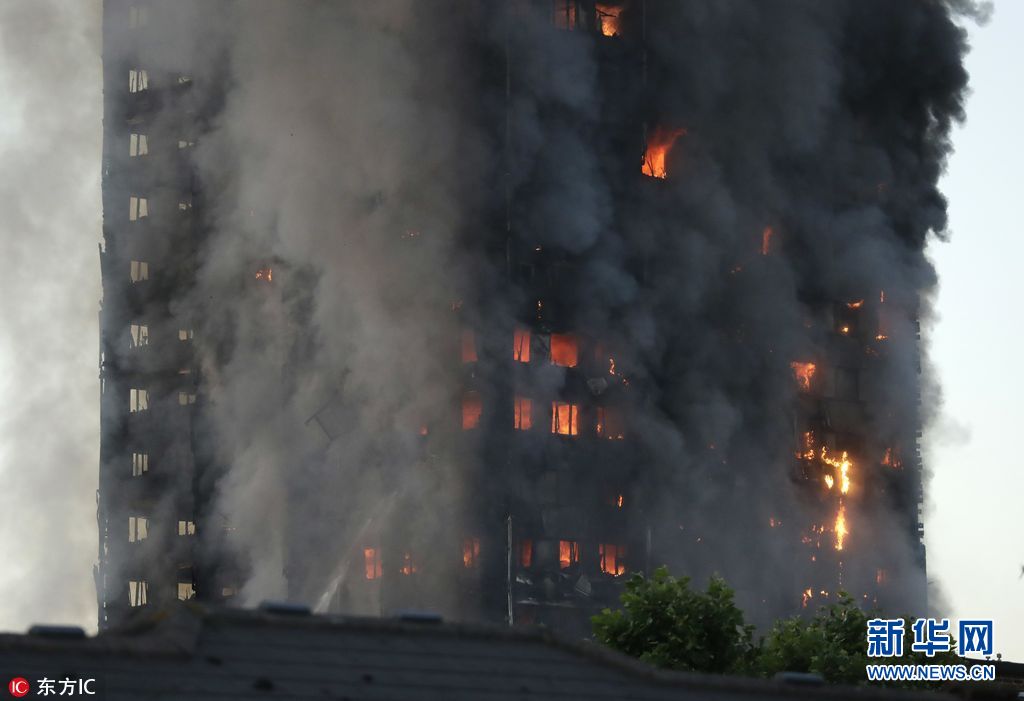当地时间2017年6月14日报道,英国伦敦西部一栋27层的公寓大楼发生大火,火势猛烈,几乎蔓延到了所有楼层。约200名消防员和40辆消防车前往灭火。(图片来源: 东方IC)
