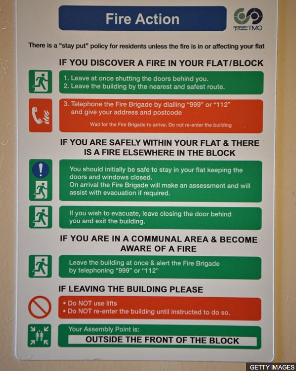 据英国广播公司(BBC)报道,住户们确实收到过公寓管理方发布的有关火灾来时“原地不动”的指导原则,建议他们遇火灾时应留在屋里,除非自己的公寓内部或公寓外部的走廊起火。