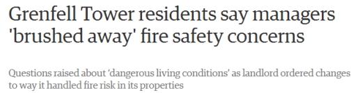 根据媒体的爆料,这座建于1974年的廉租公寓楼其实早有火灾隐患。一位火灾幸存者称,住户曾多次向“肯辛顿和切尔西的租户管理组织(KCTMO) ”表达过对消防安全的担忧:包括对楼内锅炉房和煤气管道安置位置的质疑,缺乏整栋楼的火灾报警和自动灭火系统,大楼只有一个紧急出口,而且堆满了垃圾……