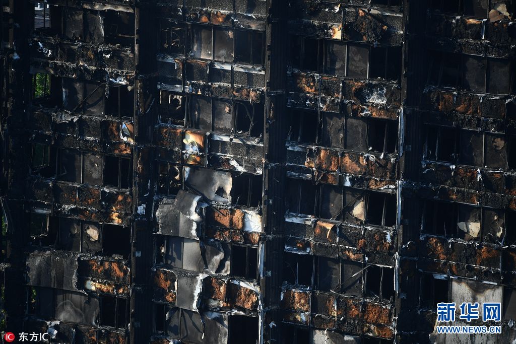 当地时间2017年6月15日,英国伦敦,火灾后的公寓楼。6月14日凌晨,伦敦西部一栋24层公寓塔楼起火,伦敦消防局出动了至少45辆消防车和200名消防员进行扑救。英国广播公司(BBC)6月15日援引警方最新消息称,大火死亡人数增至17人,警方预计该数字还会继续攀升。(图片来源: 东方IC)