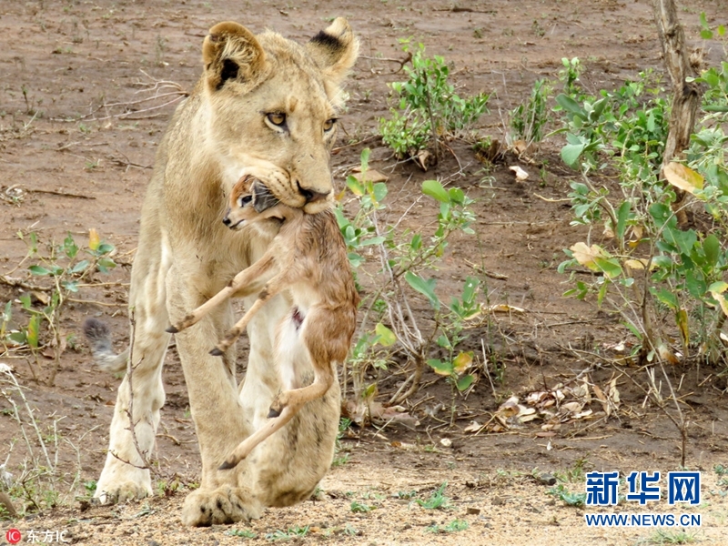 2017年6月19日报道(具体拍摄时间不详),这些照片显示了非常奇特的一幕,照片中的这头狮子看起来正在照顾着一头失去妈妈的小羚羊。画面中,狮子先是静静地与小羚羊呆在一起,还不时地用舌头舔着羚羊,然后用嘴咬住羚羊的后颈一起走着,这种方式与狮子对待自己幼崽的方式如出一辙。画面显示出狮子这种凶残野兽的柔软一面。图片来源:东方IC