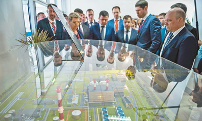 中国和俄罗斯合资建设的华电捷宁斯卡娅燃气蒸汽联合循环供热电站项目投产仪式6月20日在俄罗斯雅罗斯拉夫尔市举行。图为嘉宾参观华电捷宁斯卡娅电站项目沙盘模型。新华社发