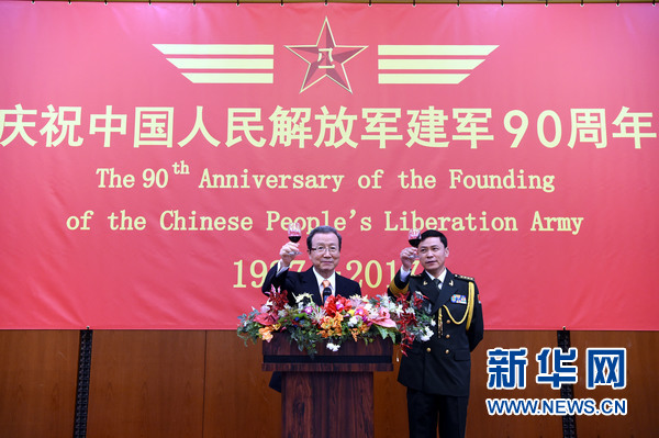 新华网东京7月26日电(方艺晓 沈红辉)7月25日,中国驻日本大使馆举行“八一”建军节招待会,隆重庆祝中国人民解放军建军90周年。中国驻日本大使程永华、武官徐新华出席招待会。日本前民主党党首海江田万里、日本防卫省防卫审议官真部朗等日本政府官员、各国武官、旅日华人华侨及中资机构代表等250余人应邀出席。