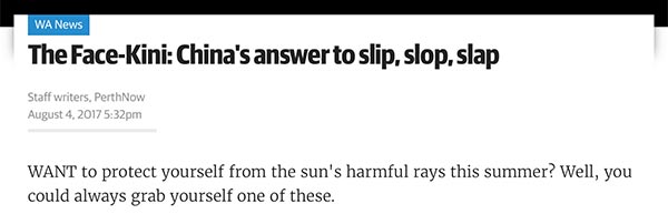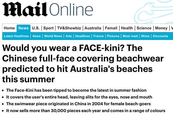 如果你想在夏天毒辣的阳光下保护自己,那你就得随身带个‘脸基尼’了。”澳大利亚当地媒体《周日时报》网站也大力推荐“脸基尼”。