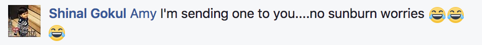 网友@Shinal Gokul圈了她的朋友Amy,表示:“我要送个脸基尼给你,你就再也不用担心被晒伤了!”