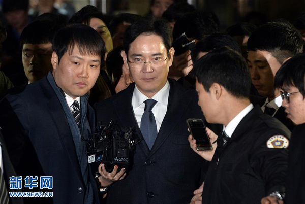 资料图片:2月16日,在韩国首尔,三星电子副会长李在镕(中)在接受法院讯问后离开。韩国首尔中央地方法院2月17日以涉嫌行贿、挪用公款等多项罪名,批准逮捕三星电子副会长李在镕。新华社/法新