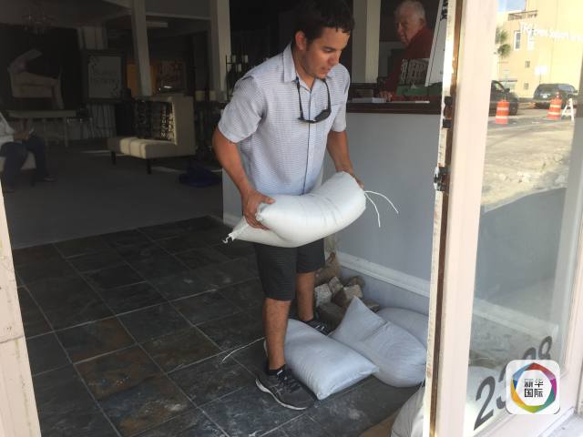 8月24日,在美国南部得克萨斯州加尔维斯顿岛,一名工作人员在店面门口堆放沙袋。(新华社发)