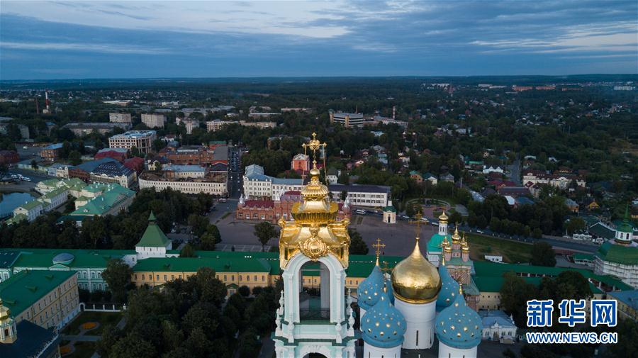 这是8月27日在俄罗斯谢尔盖耶夫镇拍摄的谢尔盖圣三一大修道院内的钟楼和教堂。