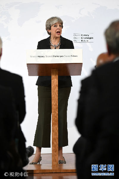 当地时间2017年9月22日,意大利佛罗伦萨,英国首相特蕾莎·梅发表“脱欧演讲”。英国首相特蕾莎·梅于22日抵达佛罗伦萨欲开启脱欧谈判,此前欧盟希望英国可以尽快进行费用结算以及明确欧盟公民的权利问题。图片来源:视觉中国