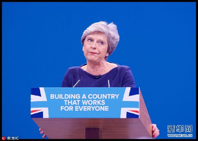 英国首相特雷莎-梅在年会上发表演讲。(图片来源: 东方IC)