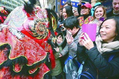 在英国伦敦,演员在庆祝中国农历春节的游行中表演。图片为新华社发