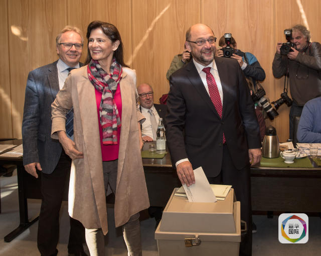 9月24日,在德国西部的维尔瑟伦,德国社会民主党主席、总理候选人舒尔茨(前右)在位于市政厅的投票站参加联邦议院选举投票。(新华社发, 约阿希姆·毕瓦勒兹摄)