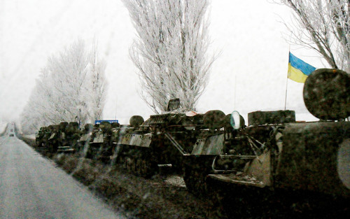 资料图片:这是2016年12月24日在通往乌克兰顿涅茨克市的路上拍摄的从前线撤回的乌政府军装甲车。新华社记者 陈俊锋 摄