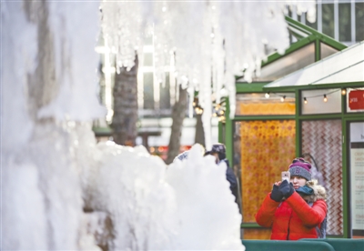 1月2日,在美国纽约布赖恩特公园,一名女子拍摄结冰的喷泉。新华社记者 王 迎摄