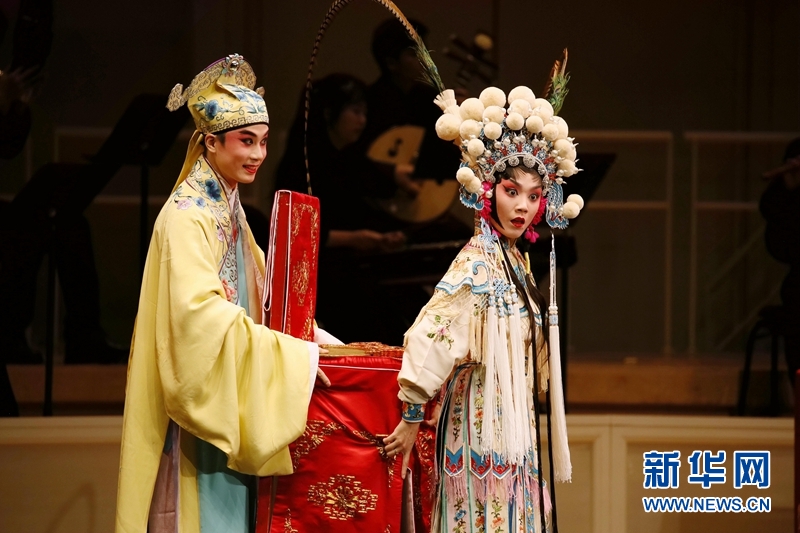 2月17日,在美国芝加哥交响乐中心,来自重庆市川剧院的演员表演川剧《宫会》。