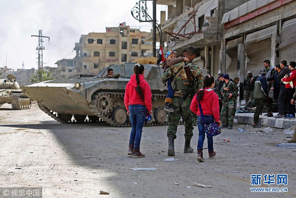 3月19日,叙利亚古塔东南部,叙利亚亲政府武装进入Kafr Batna主广场。(图片来源:视觉中国)